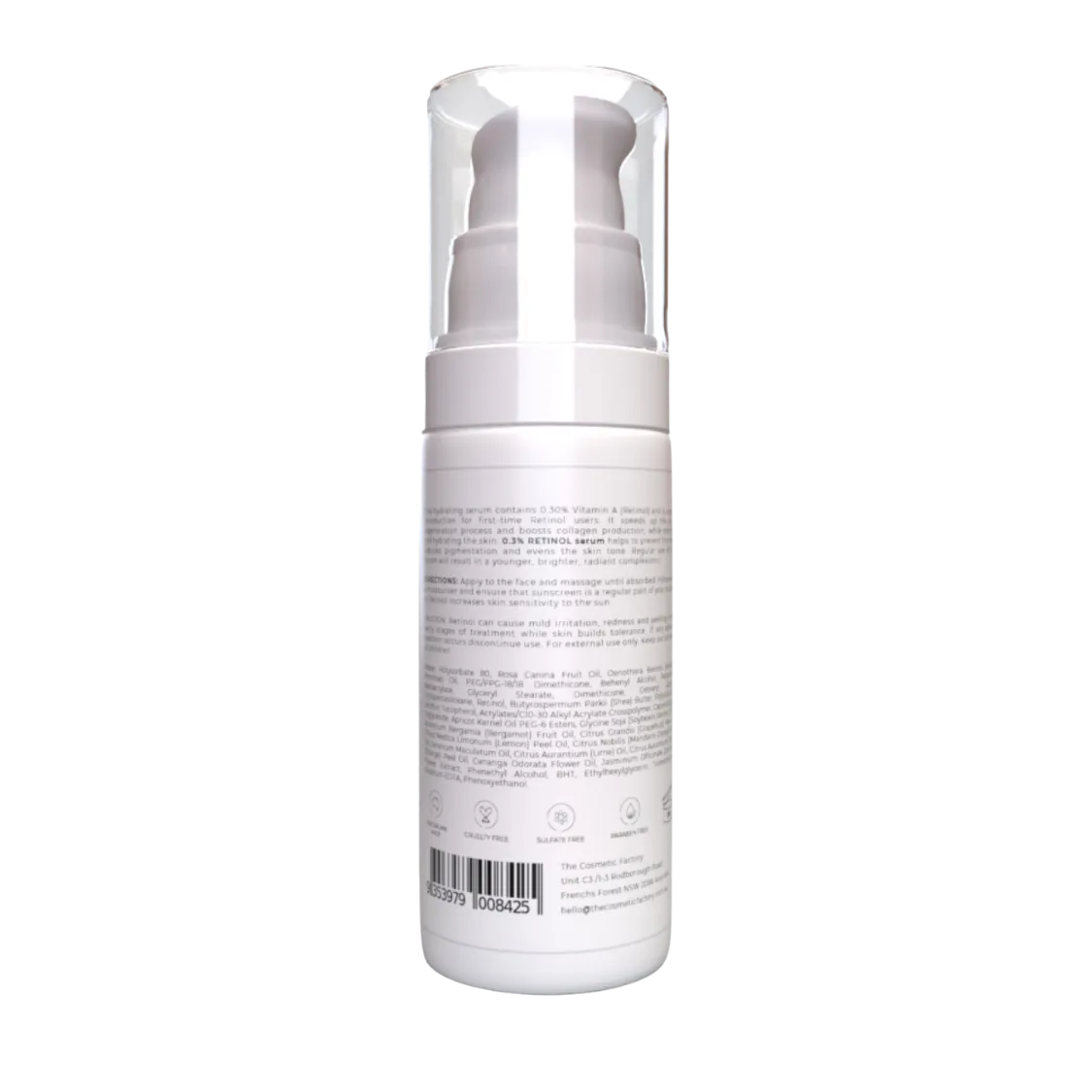 ABOUT: This hydrating serum contains 0.3% Vitamin A (Retinol) and is a great introduction for first-time Retinol users. It speeds up the skin's regeneration process and boosts collagen production while soothing and hydrating the skin. 0.3% RETINOL serum helps to prevent fine lines, reduces pigmentation and evens the skin tone. Regular use of this serum will result in a younger, brighter, radiant complexion. KEY BENEFITS: