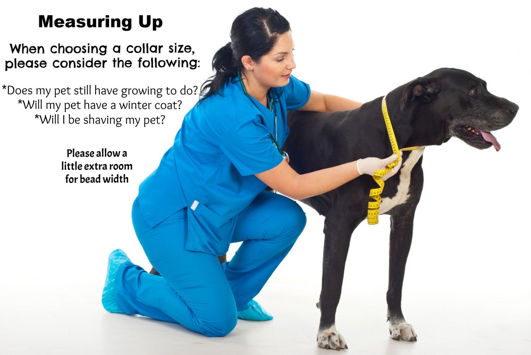 • To measure, place a tape measure / string around the neck of your dog or cat. Place a finger in between the tape measure/ string and the coat of your animal to allow for bead width. All collars are adjustable.